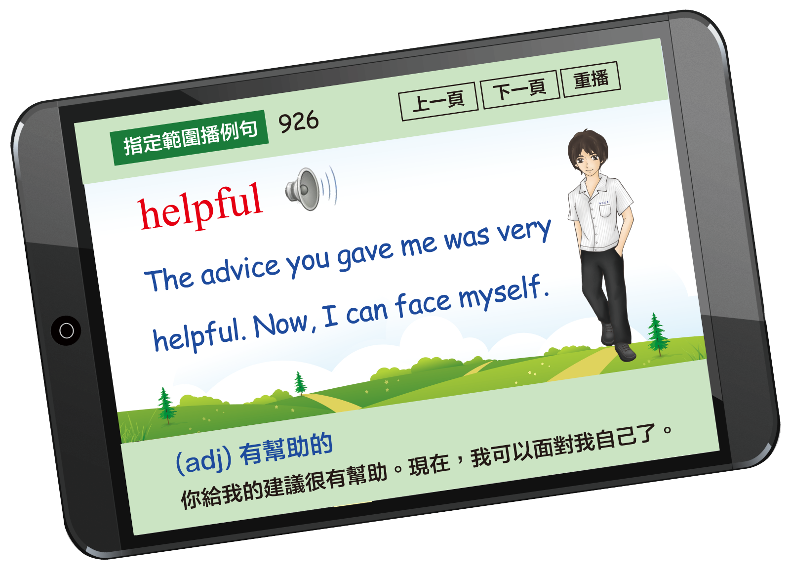 可指定範圍或主題 同時呈現單字與例句 支援逐字發音 |